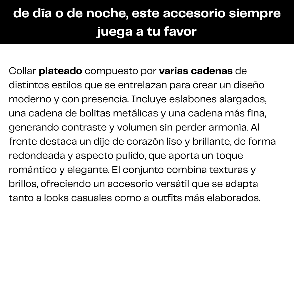 Válido para este producto y todos los de la categoría: Accesorios, Accesorios -> Collares, Accesorios -> Brazaletes, Accesorios -> Aros, Accesorios -> Fajas y cinturones, Accesorios -> Carteras, Accesorios -> Anillos.
